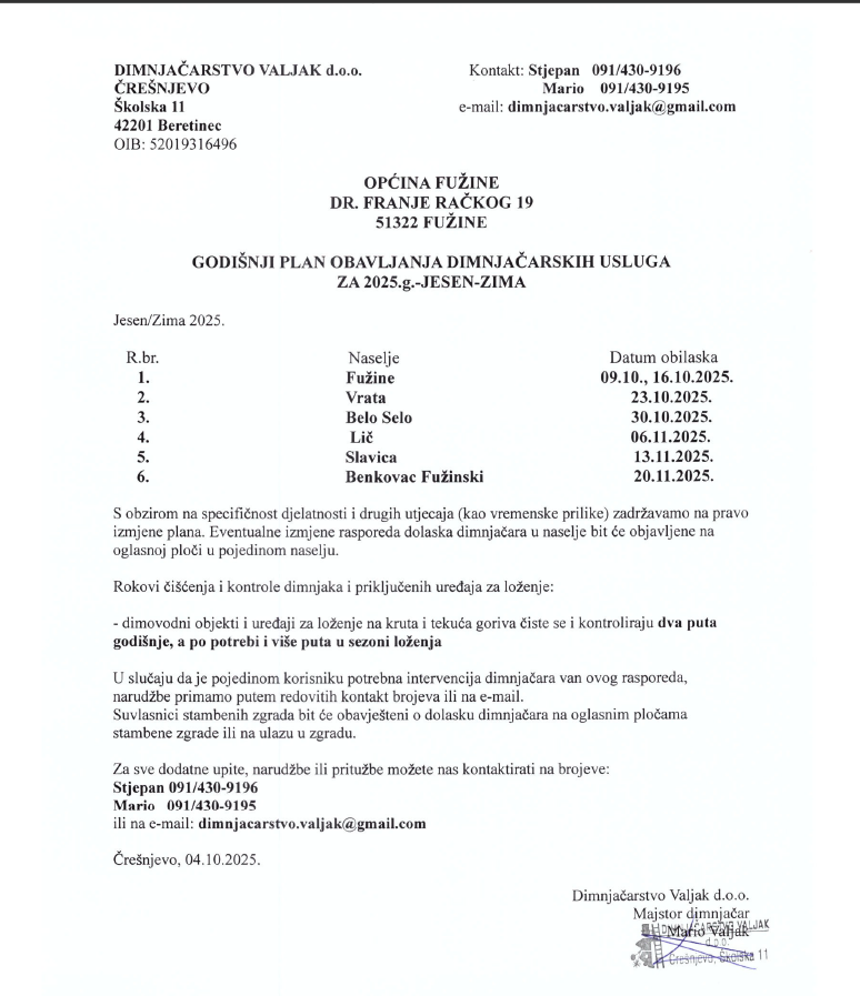 Godišnji plan obavljanja dimnjačarskih usluga za 2025. godinu
