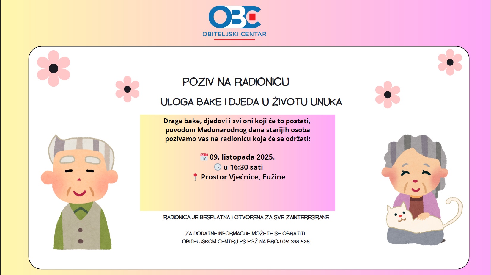 Povodom obilježavanja Međunarodnog dana starijih osoba u organizaciji Obiteljskog centra Područne službe Primorsko-goranske, dana 09.10.2025. godine (četvrtak) u vijećnici Općine Fužine s početkom u 16:30 sati održati će se radionica "Uloga bake i djeda u životu unuka".